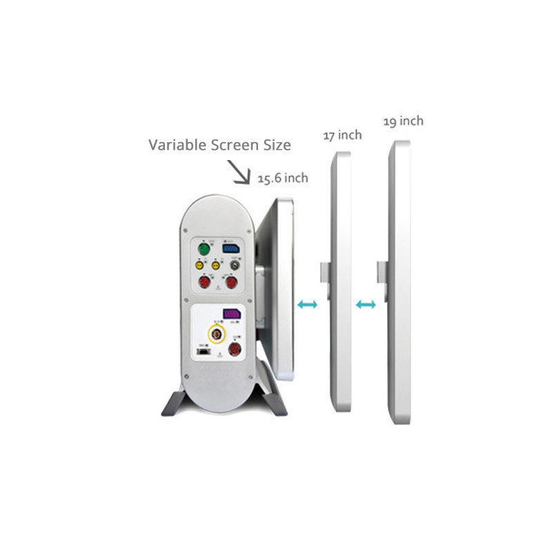 17- или 19- дюймовый дисплей, сенсорный экран, ЭКГ в 12 отведениях, цифровой или Masimo SpO 2 , 2/4/6 IBP, сердечный выброс, анализатор EtCO 2, анализатор нескольких газов, BIS, NMT, HDMI, тепловизор, Проводная / беспроводная CMS